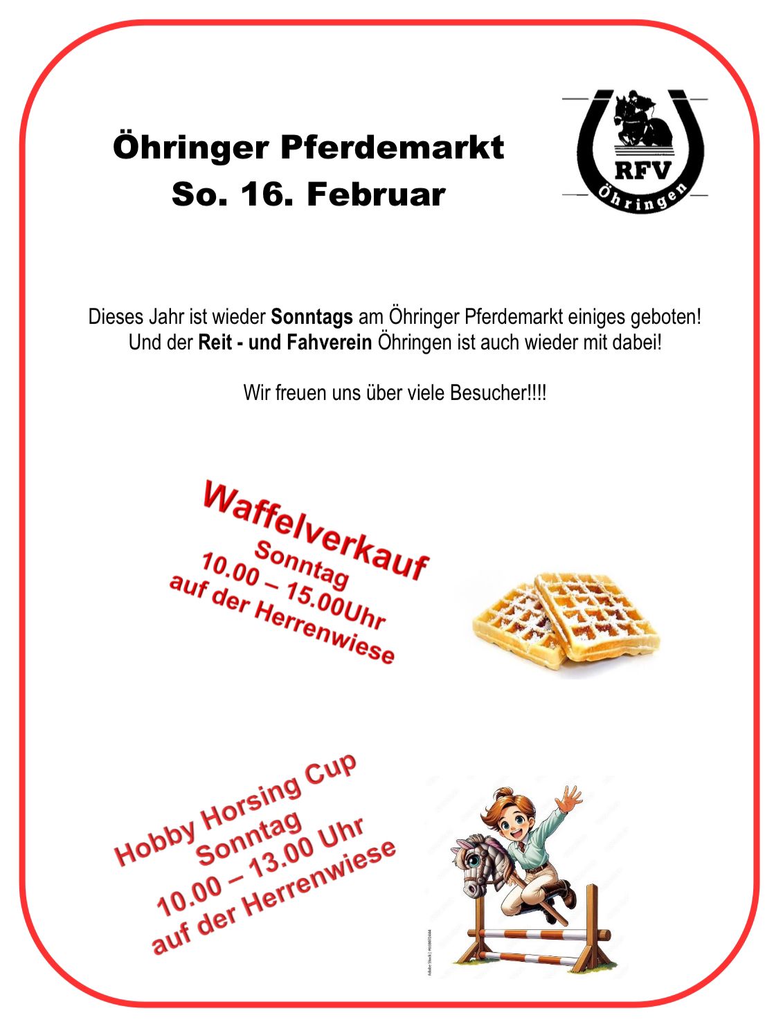 | So. + Mo.  16. + 17.2.25  | Waffelstand und Hobby-Horsing-Parcour unserer Vereinsjugend auf der Herrenwiese beim Pferdemarktprogramm (Info) | ||||||||||||||||||||